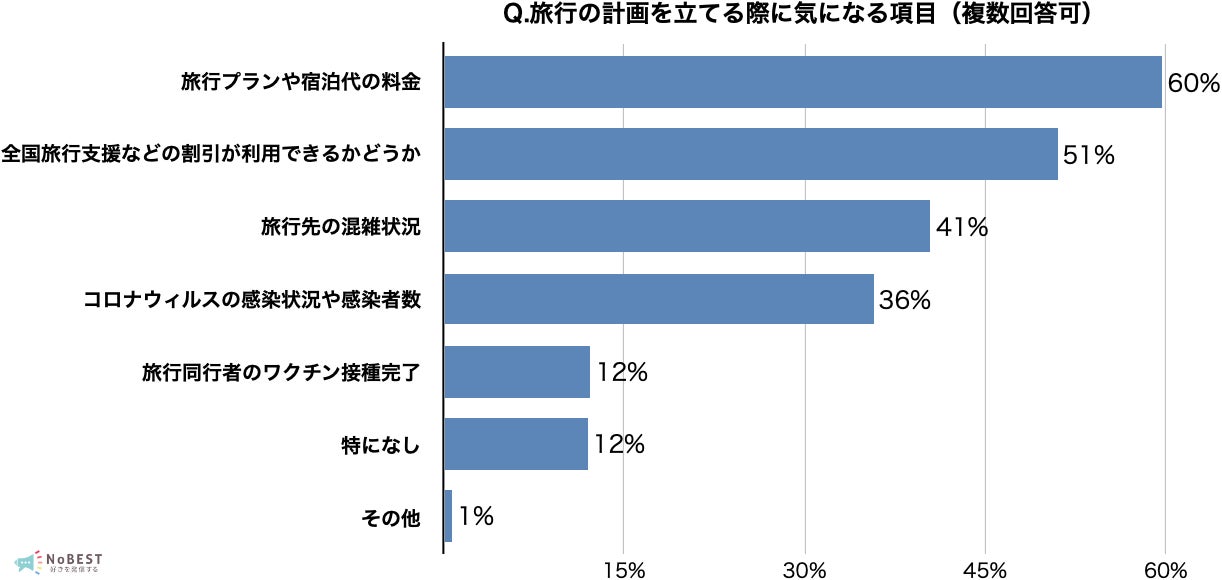 また、旅行の計画を立てる際に「旅行先の混雑状況」(41%)「新型コロナウイルスの感染状況や感染者数」(36%)も気になる項目として挙がっており、コロナウイルスへの不安がゼロになったわけではないのが現状です。